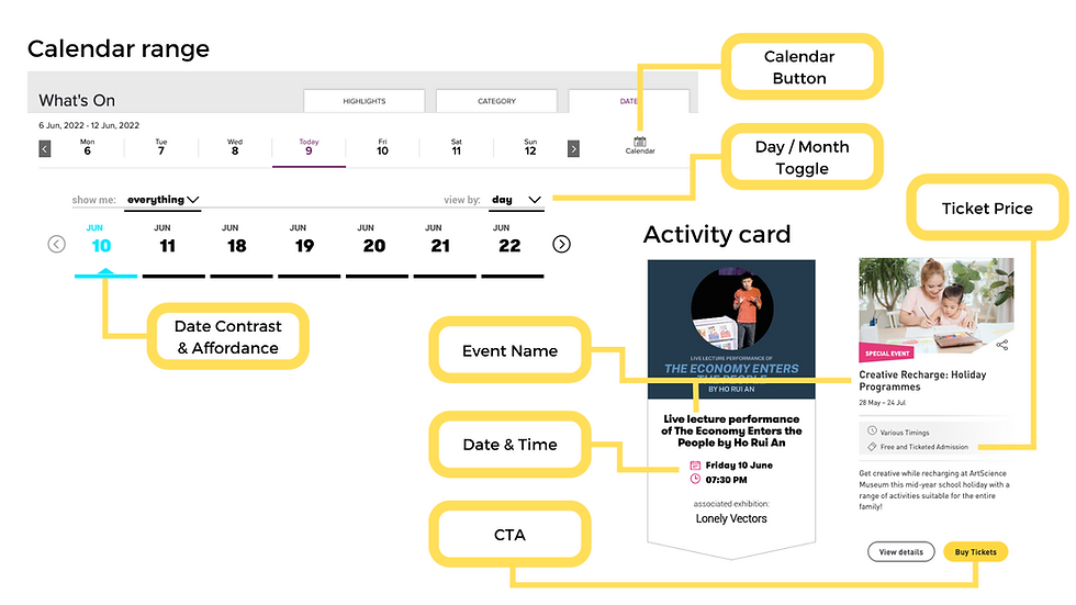 Our redesigned website aims to bridge the gap between MCCY, the organisations under MCCY and users. Users will have more streamlined results which caters to their preference (e.g. date, time or location). Our redesigned website also allows users to access and potentially book any activity without leaving the MCCY's website.